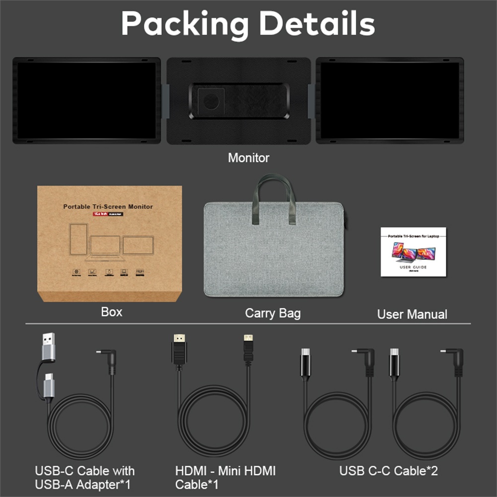 *Standard accessories: USB C-C Cable with USB A adapter*1, USB C-C data cable*2, HDMI-Mini HDMI cable*1, Carry bag, User manual, Box